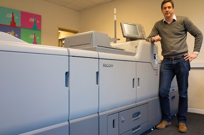 Mike Dumbreck, owner of the Print Bureau, with the Ricoh digital press Despite two floods in less than a month the Print Bureau in…