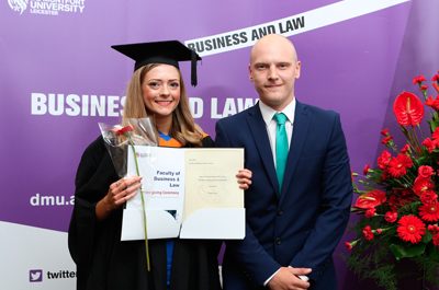 DMU graduate Emma Neary and Matt Lawrenson, senior group marketing executive, GI Solutions The company awarded the prize for best BA (Hons) Marketing & Media…