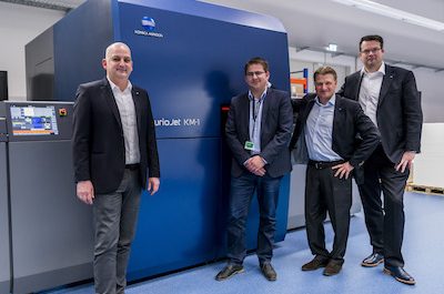 (L-R) Christian Rittmöller, Konica Minolta, with Daniel Baier of Rehms Druck, and Markus Neumann and Thorsten Kinnen, both Konica Minolta For its first investment…