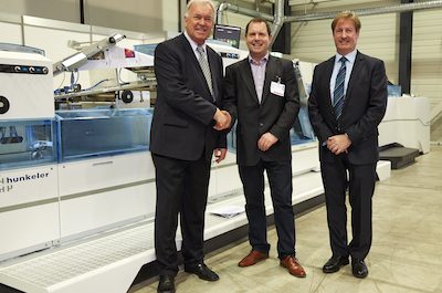 (L-R) Franz Hunkeler, chairman of the board of Hunkeler AG, Andy Cork, managing director of Print on Demand, and Robin Brown, national sales manager for…