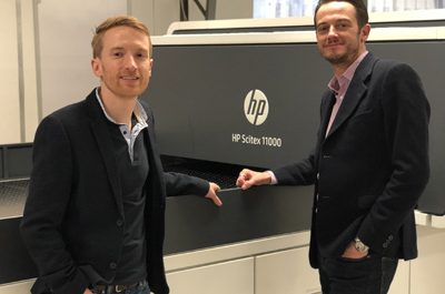 Iain Clasper-Cotte (L), UK MD, Northern Flags and FaberExposize, with Gary Giles, account manager, Agfa Graphics One of the UK’s largest fabric printers,…