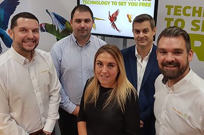 Deal done: (L to R) Lee Ward, global sales director, Tharstern; Darren Ibrahim and Charleigh Ibrahim, directors, Murray Sale, sales manager, Europa Print and Mailing…