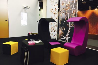 Chairs and cubes covered with sound absorbing digitally printed fabric by PONGS Textiles, one of the exhibitors and speakers at PID 2018 An intense…