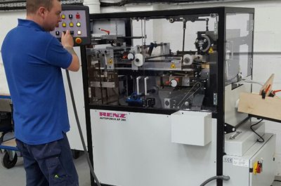 Charles Hewines, head of procurement at Penstripe, with the unique Renz-Palamides combination line Leeds-based Penstripe has linked its recently purchased Renz AP-360 punching system…