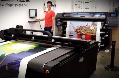 Senior designer Daniela Phillips testing out some wall vinyl prints, Display Signs has had a surge of orders after it invested in a HP FB700,…