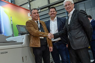 Voyage of disc-overy: (L to R) Direct CDs operations director Fuat Fuat, managing director Martin Crowson and Ricoh production print sales specialist Adrian Stark …