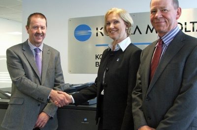 Neil Handforth and Bob Usher of Apex flank Caroline Mannering, regional sales manager at Konica Minolta. Digital printing equipment supplier Konica Minolta and Apex Digital Graphics,…