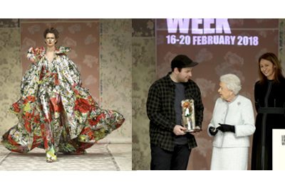A piece from the collection, and Richard Quinn receives the award from Her Majesty The Queen, with British Fashion Council CEO Caroline Rush Her…
