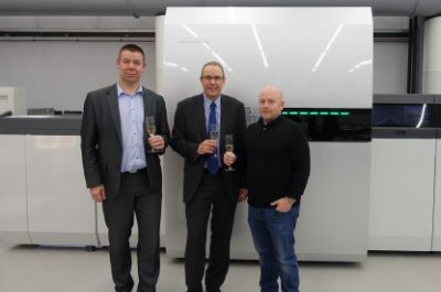 (L- R) Robert Holscher, director of digital Sales, Komori International Europe; Steve Turner, director of sheetfed sales, Komori UK; Garth Davis, managing director, Lexon GB…